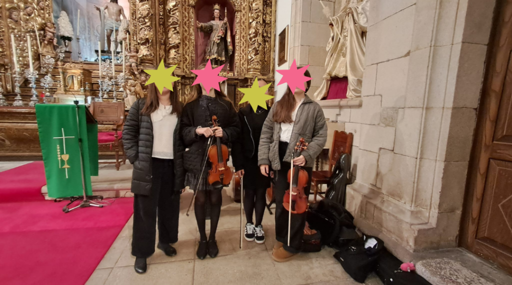 Los alumnos fueron llegando a la iglesia y entre que afinaron sus instrumentos, echaron resina,… Los familiares se fueron poniendo cómodos para escuchar a sus “ídolos”.