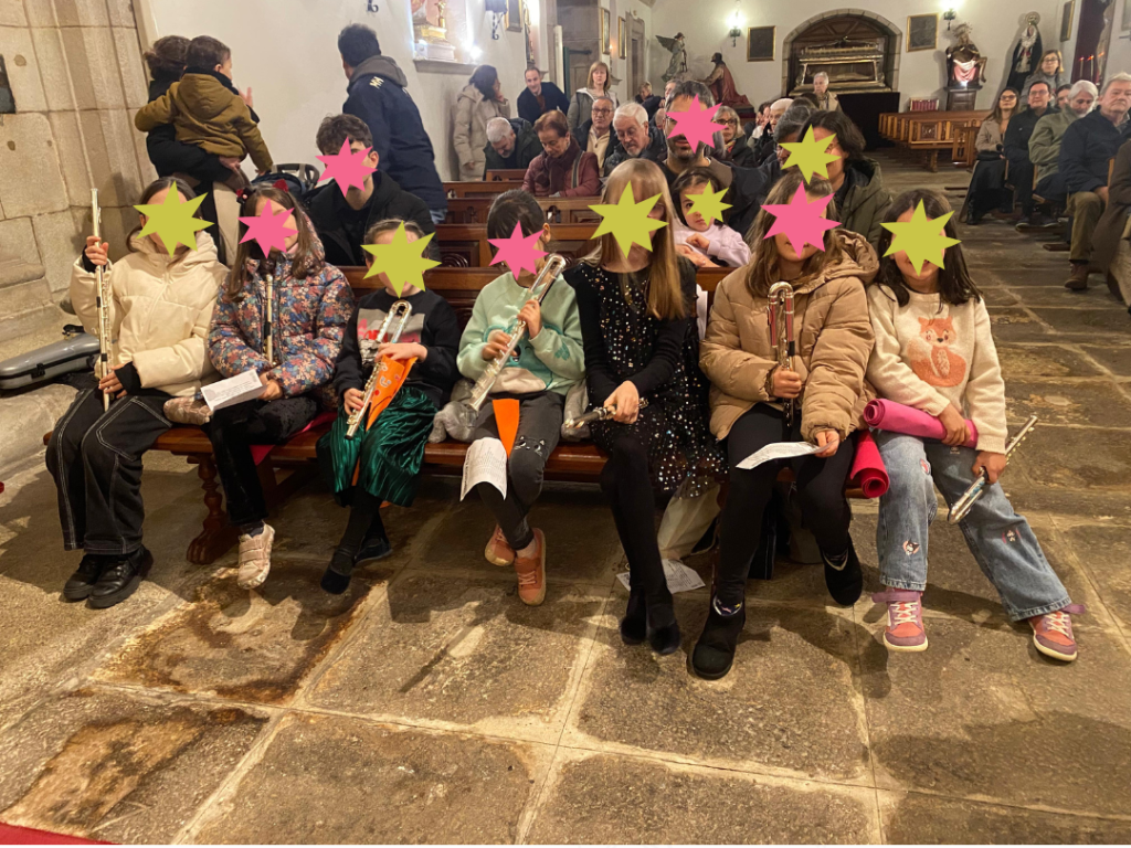 Los alumnos fueron llegando a la iglesia y entre que afinaron sus instrumentos, echaron resina,… Los familiares se fueron poniendo cómodos para escuchar a sus “ídolos”.