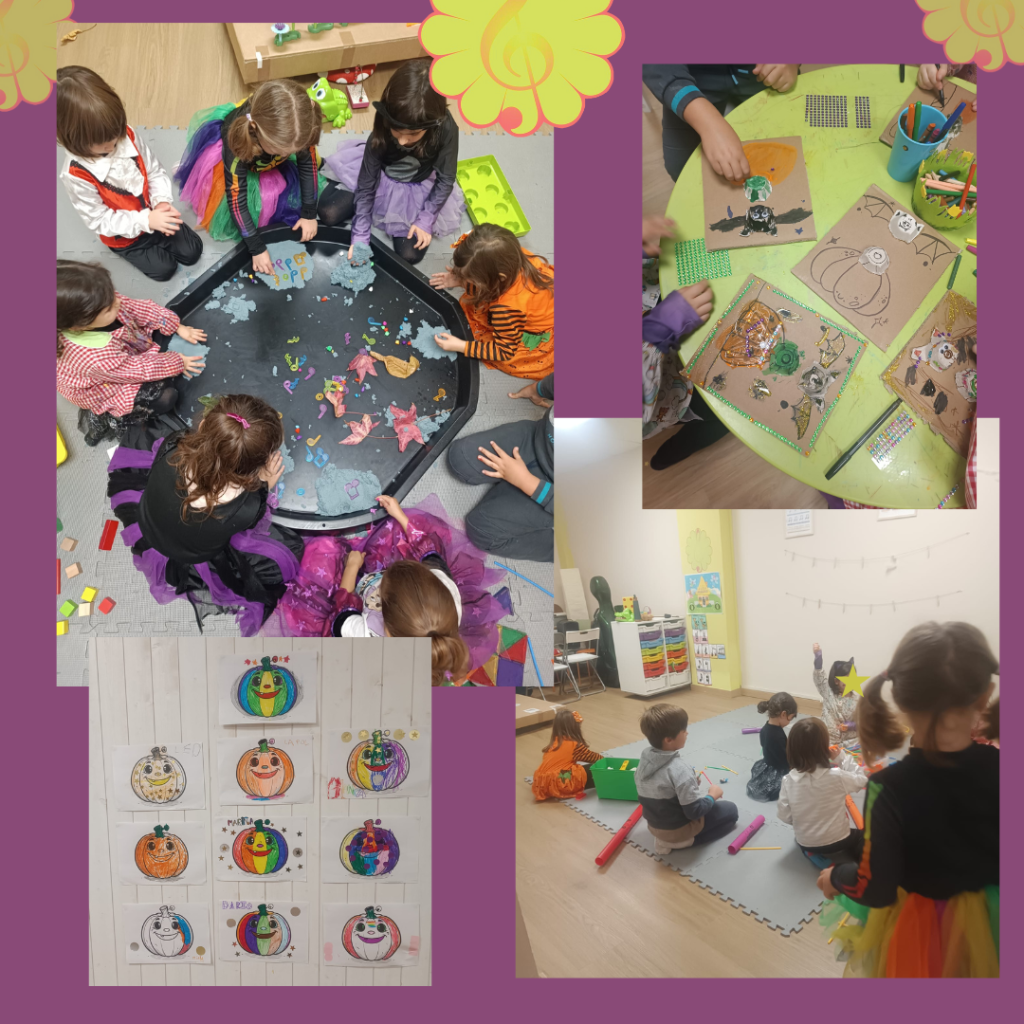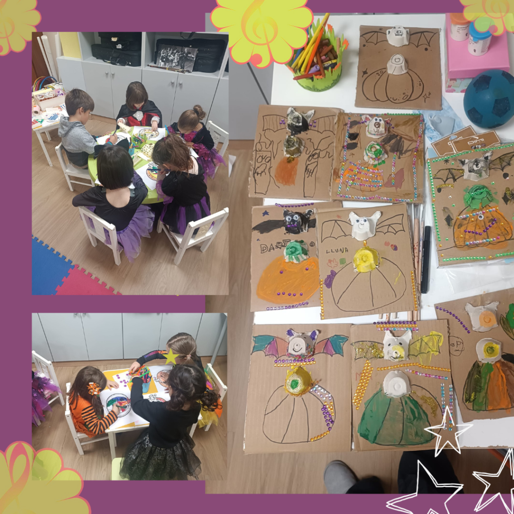 Toda la mañana estuvo llena de actividades. Manualidades, juegos, gincanas, murciélagos hechas con hueveras, murales de calabaza… ¡No paramos! Entre el aula grande y el aula alargada, Método Suzuki A Coruña se convirtió en una pequeña escuela de brujería.
