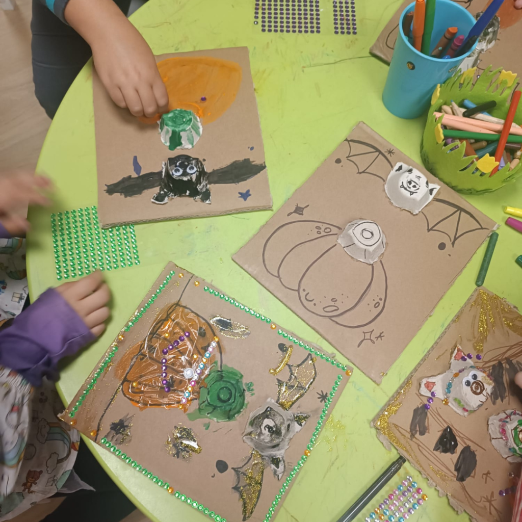 Toda la mañana estuvo llena de actividades. Manualidades, juegos, gincanas, murciélagos hechas con hueveras, murales de calabaza… ¡No paramos! Entre el aula grande y el aula alargada, Método Suzuki A Coruña se convirtió en una pequeña escuela de brujería.